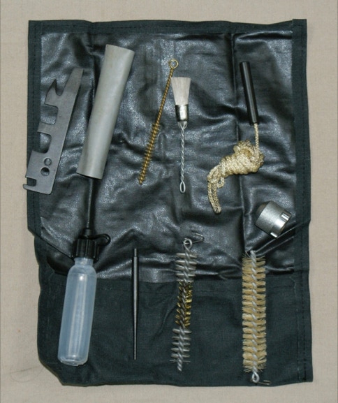 Military Surplus East German AK-47 & AK-74 1980s cleaning kits. Includes bore, chamber and action brushes, plastic oil bottle, pull-through, combination tool, punch and roll pouch. Several lots to sell. These are new old stock cleaning kits. Never used. $7.50 each or 5 for $30