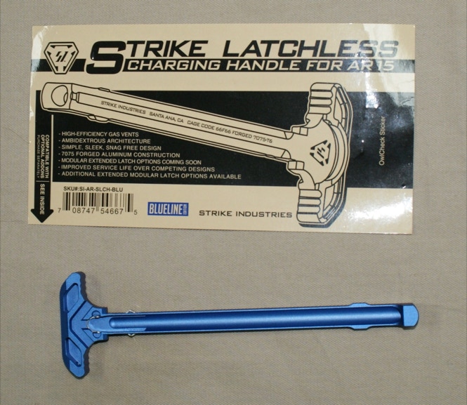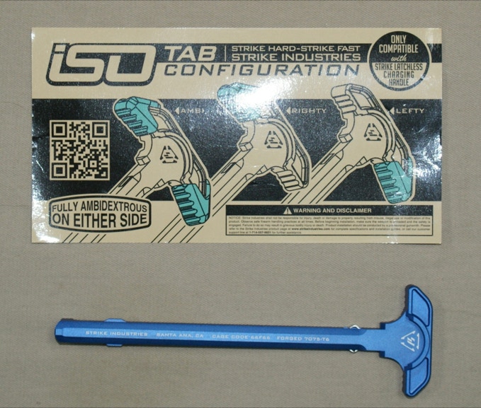 The Strike Latchless Charging Handle represents yet another step forward for the AR 15. Simple in its execution, yet robust and reliable, the revolutionary Strike Latchless Charging Handle offers forged 7075 construction, efficient side gas venting, and a solid, comfortable interface for the user. Reliable receiver lockup is achieved through a novel hidden spring mechanism that uses the Charging Handle insertion slot in the upper receiver charging handle channel. This channel features a natural radius that will not wear rapidly like the external, 90-degree edge of the standard CH latch area of the upper receiver. The flat spring bearing surface is much larger than a steel ball bearing, spreading force and wear out over a larger area. Increased service life is one benefit of this type of system, as is the comfort and peace of mind that come from a lack of moving or external components that can break or snag/catch on your gear and foreign objects. The solid aluminum construction is durable and provides a solid mounting point for the ISO Tabs, an add-on component that increases surface area for those using large optics and/or gloved hands.